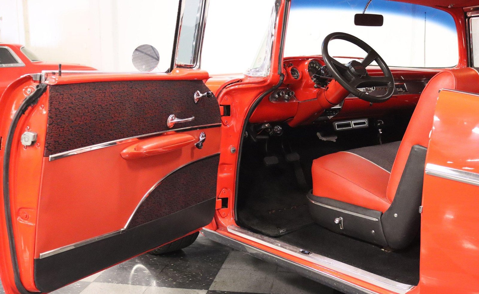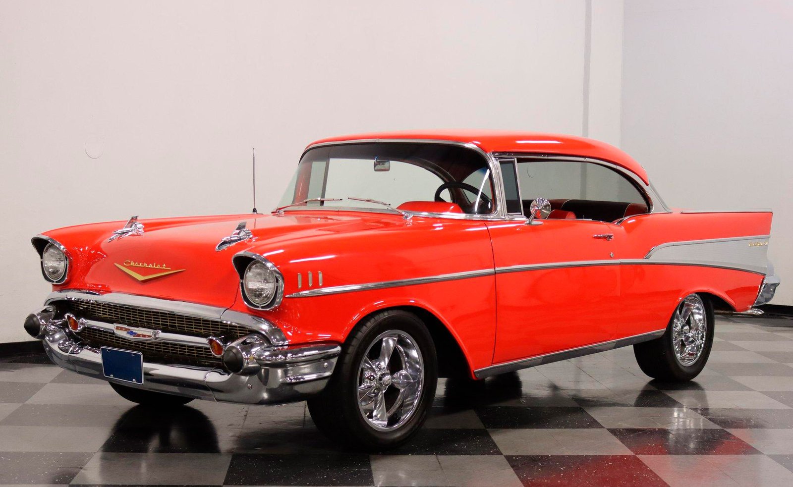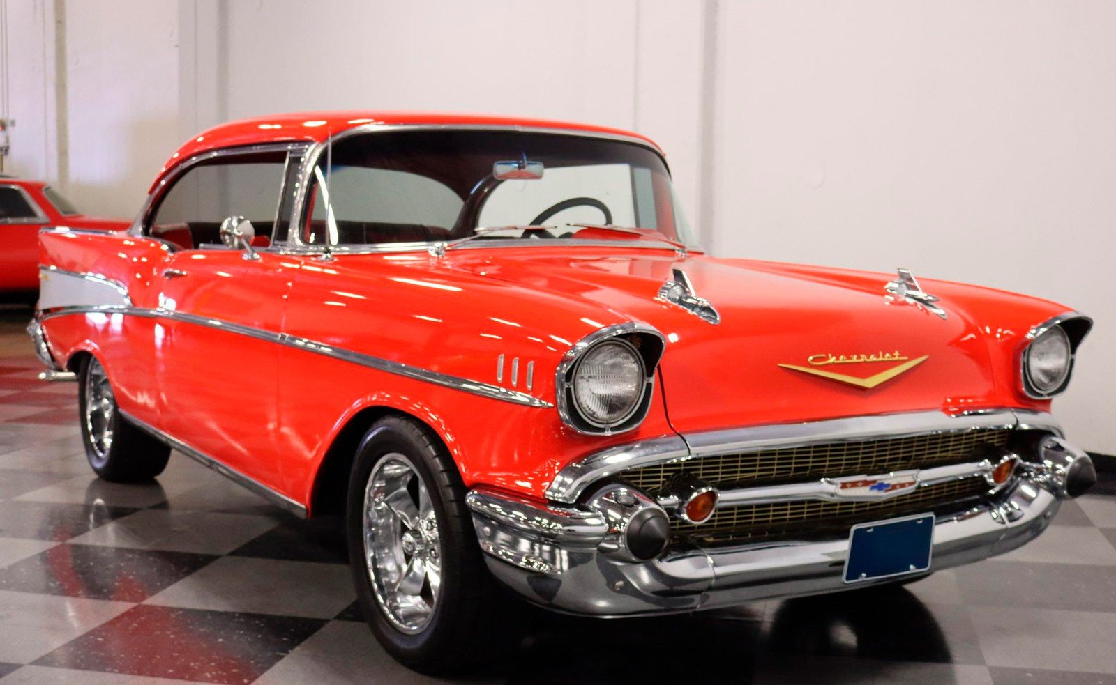 A beautifully restored 1957 Chevrolet Bel Air finished in striking red — powered by a BluePrint 383 stroker V8 and 5-speed manual, combining timeless Tri-Five styling with upgraded performance and comfort.