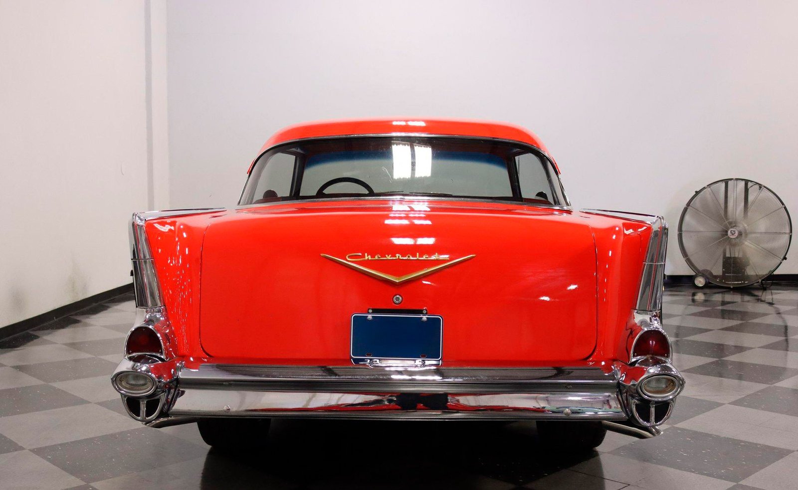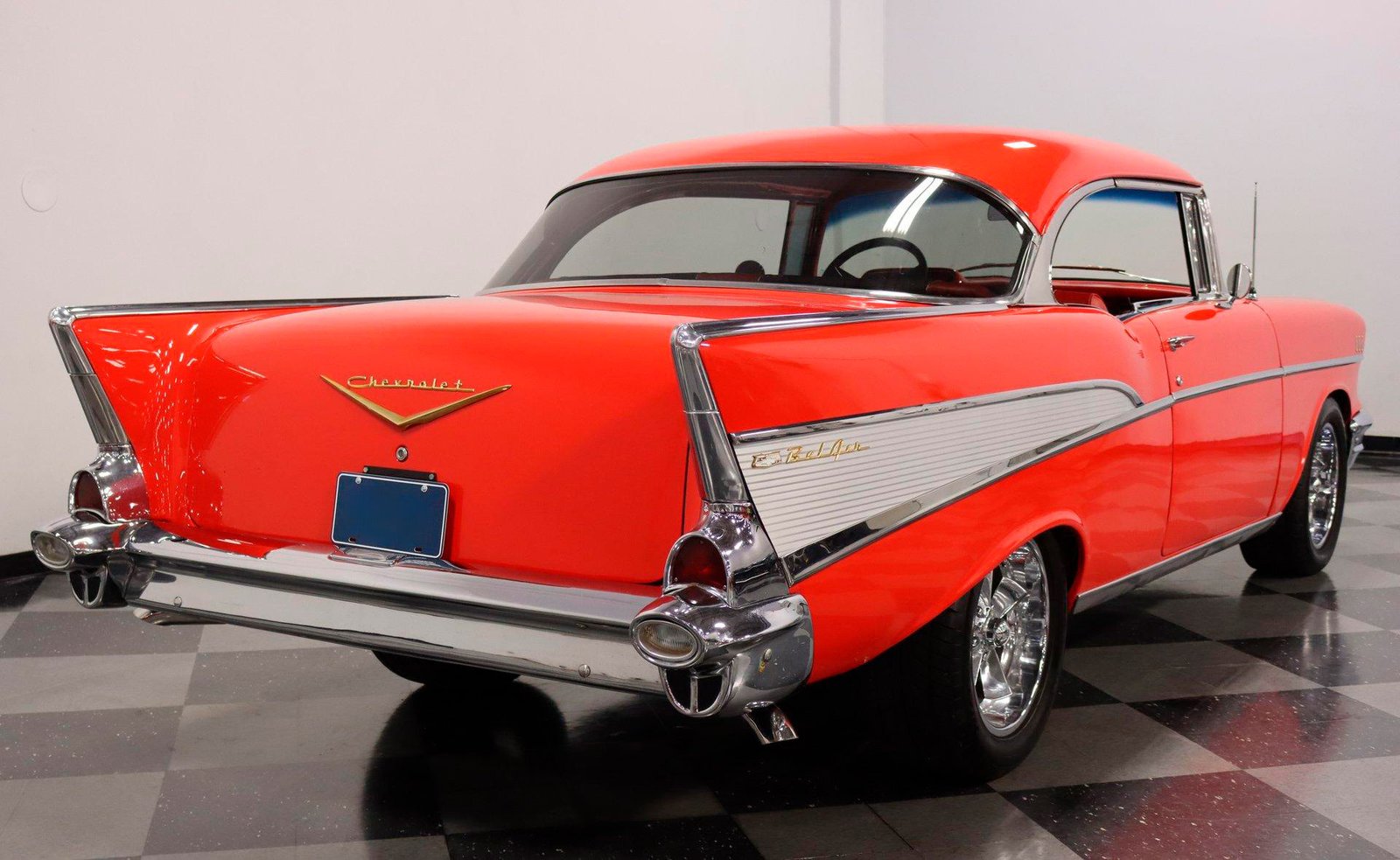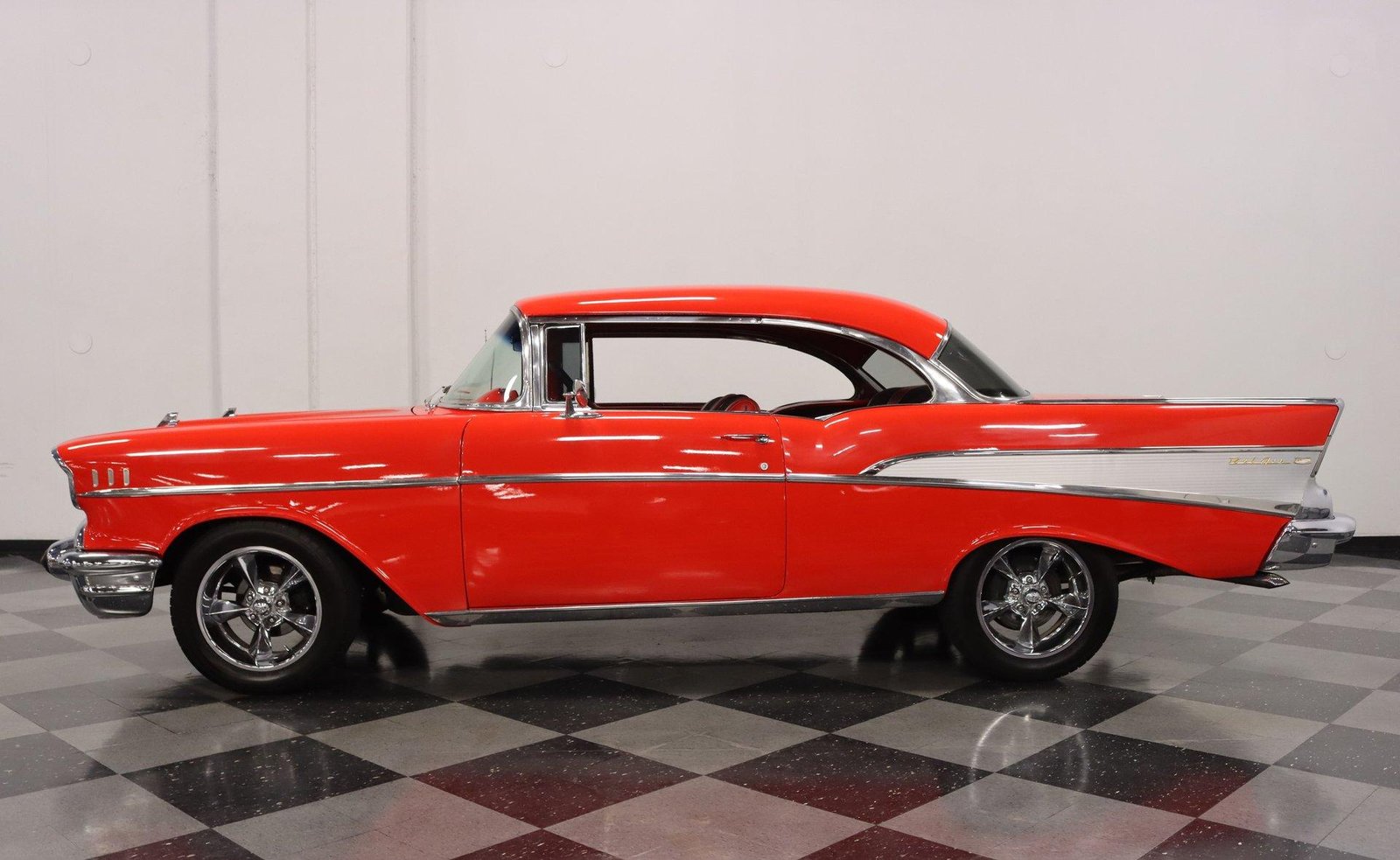 A beautifully restored 1957 Chevrolet Bel Air finished in striking red — powered by a BluePrint 383 stroker V8 and 5-speed manual, combining timeless Tri-Five styling with upgraded performance and comfort.