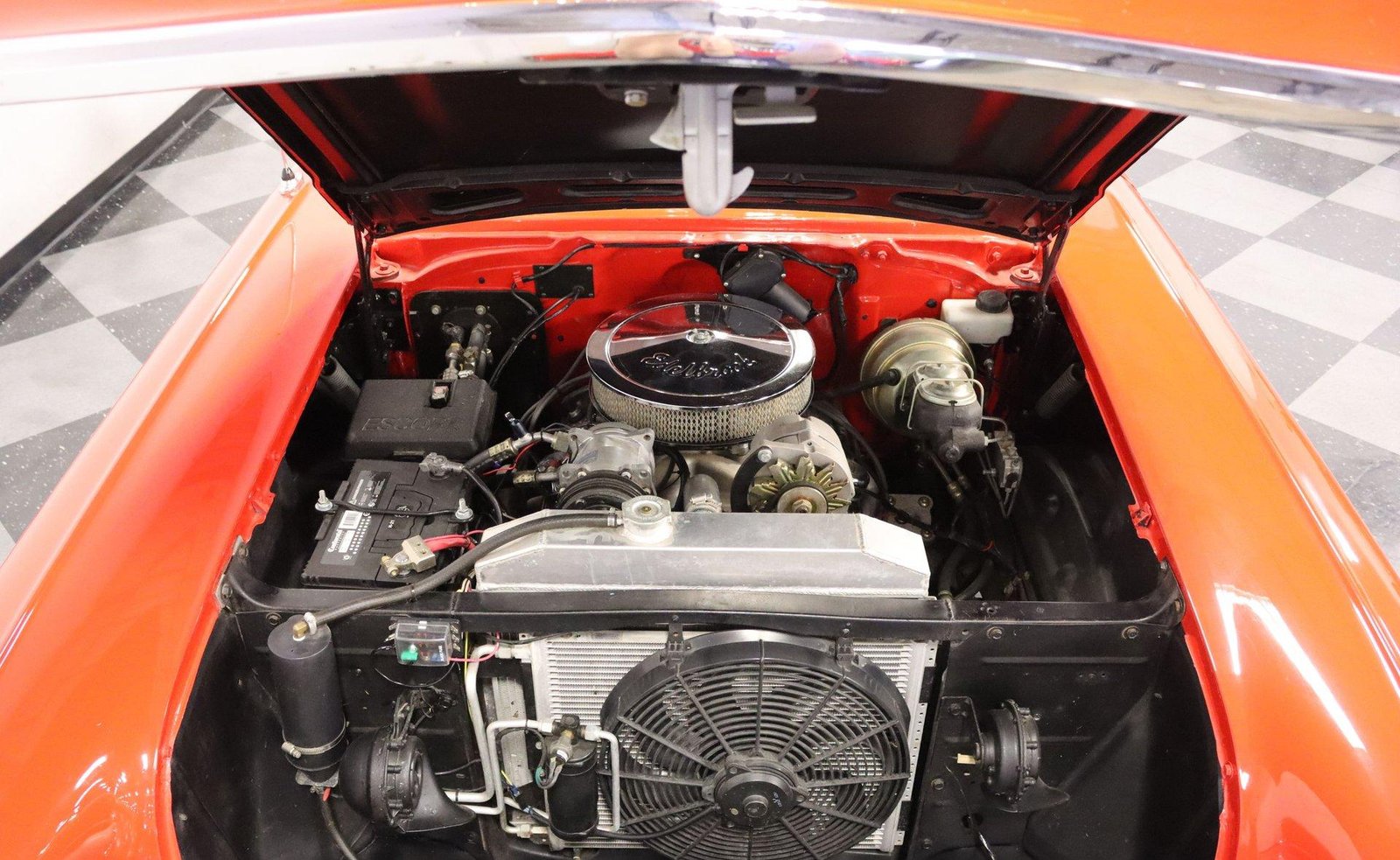 Interior: Red and black two-tone interior with classic textured upholstery, Hurst floor shifter, Sunpro tachometer, tilt steering column, custom Autosound AM/FM radio with iPod input, tinted glass, and A/C (needs service).