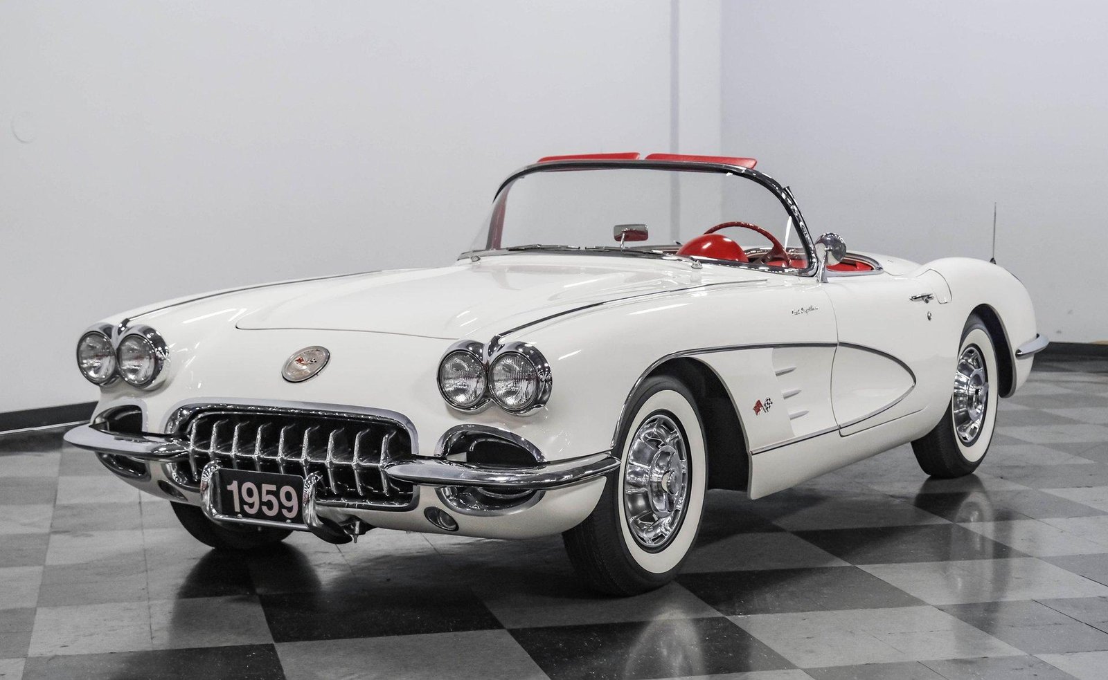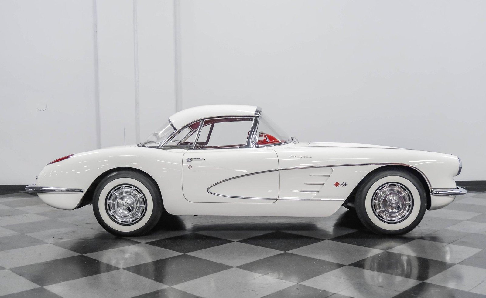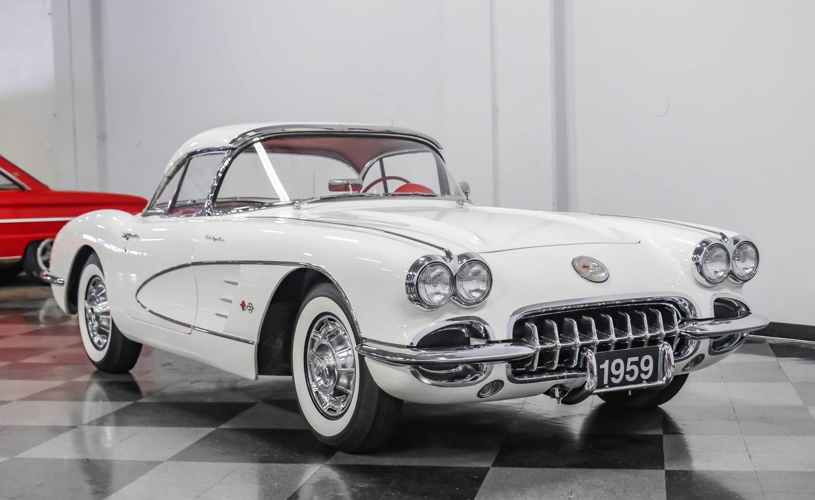 An exceptionally rare 1959 Chevrolet Corvette Fuelie finished in Snowcrest White with red interior — featuring its period-correct 283 V8 with Rochester fuel injection, 4-speed manual, and both hard and soft tops.
