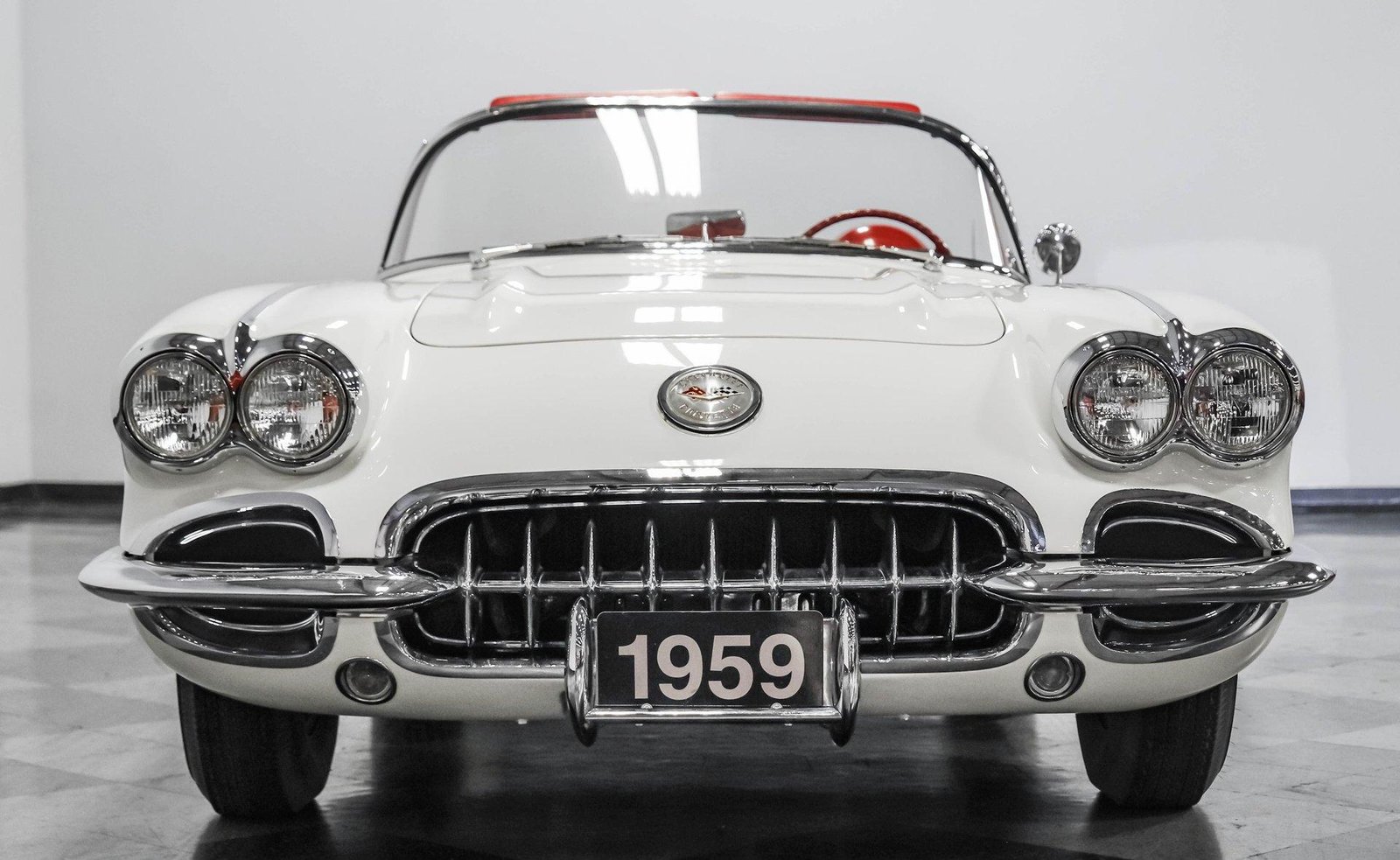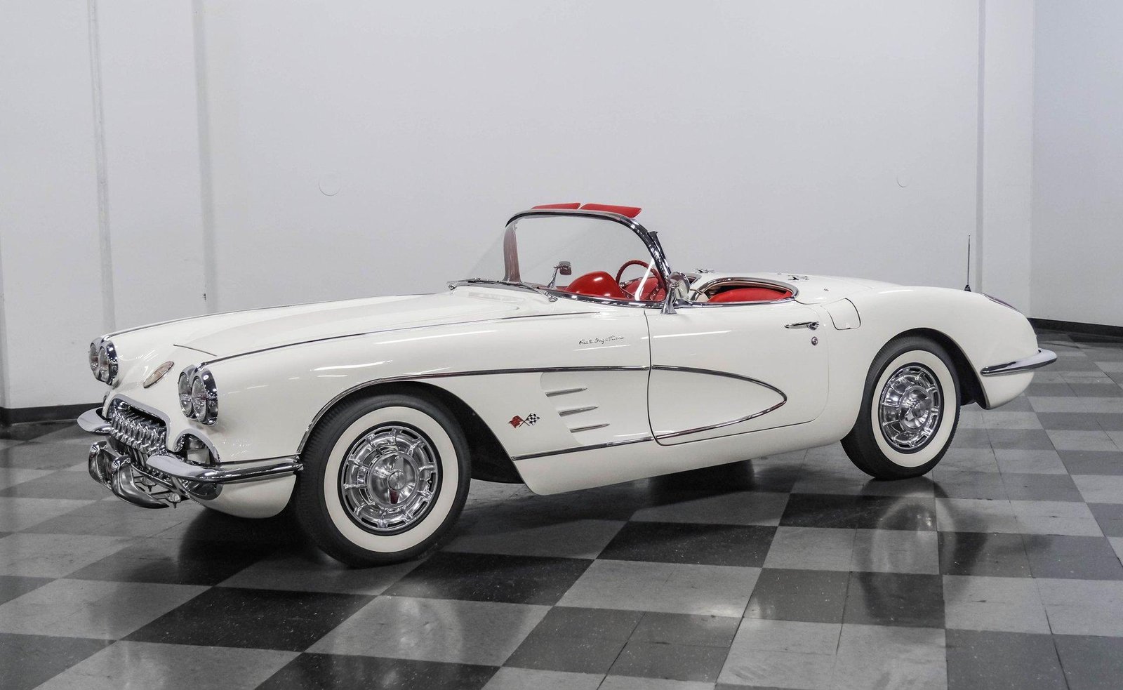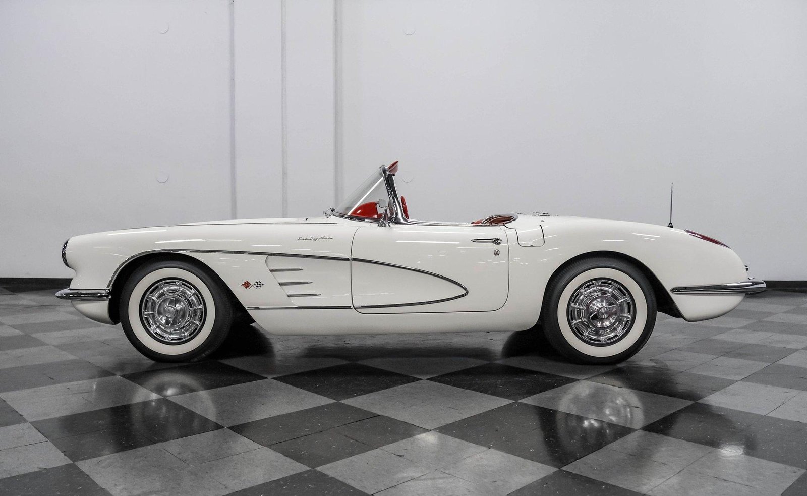 An exceptionally rare 1959 Chevrolet Corvette Fuelie finished in Snowcrest White with red interior — featuring its period-correct 283 V8 with Rochester fuel injection, 4-speed manual, and both hard and soft tops.