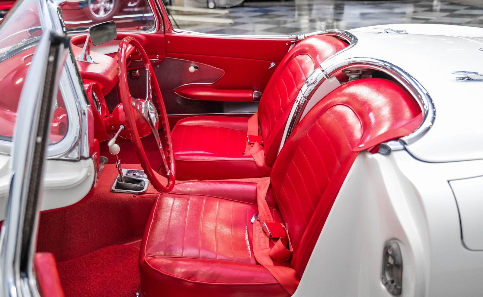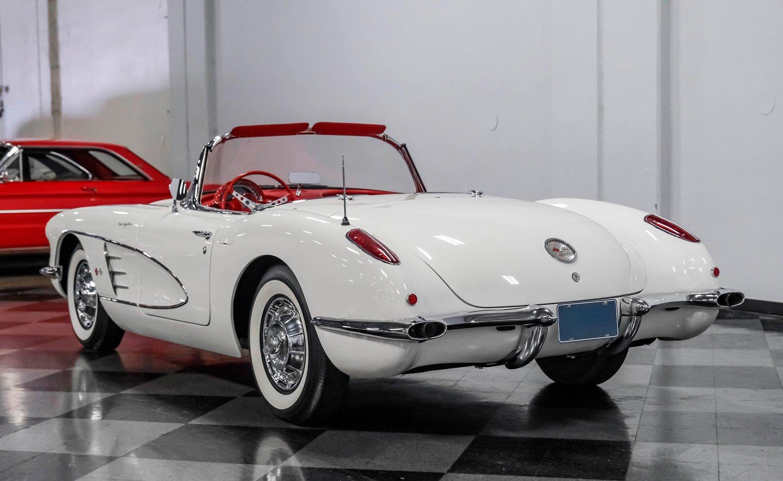 Exterior: Snowcrest White exterior with white vinyl convertible top and matching white fiberglass removable hardtop, chrome side trim, 15″ wheels, and 6.70-15 BFG Silvertown whitewall radials.