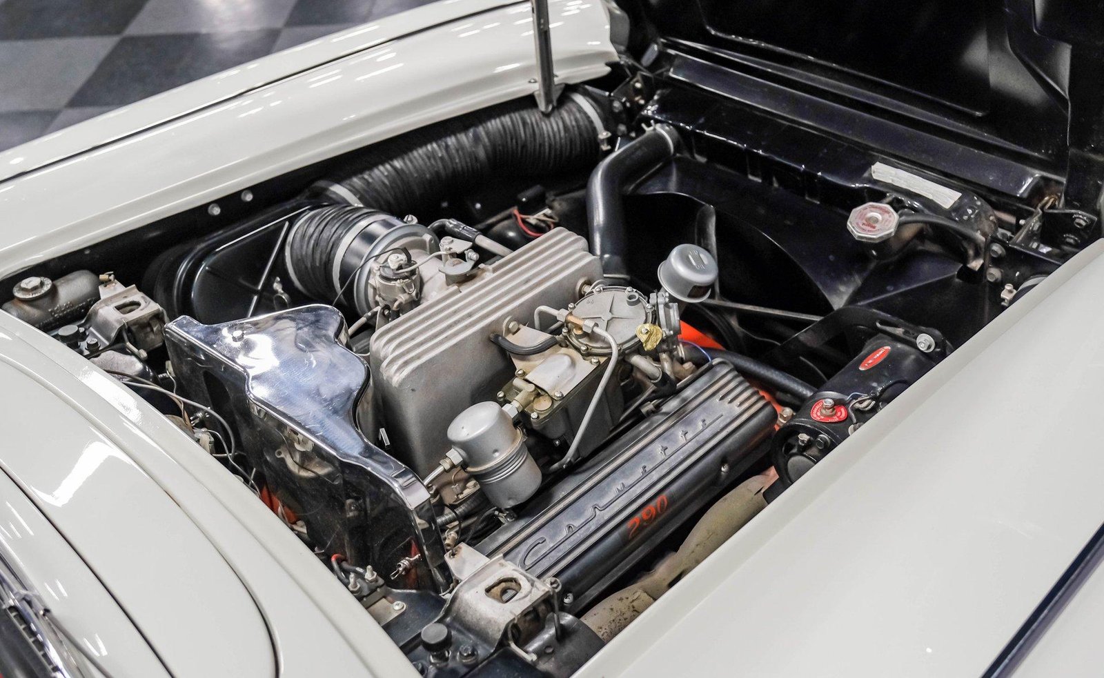 Engine & Drivetrain: Period-correct 283 ci V8 with Rochester fuel injection, solid lifters, and dual exhaust system producing 290 hp. Power delivered through a 4-speed manual transmission for pure mid-century sports car engagement.