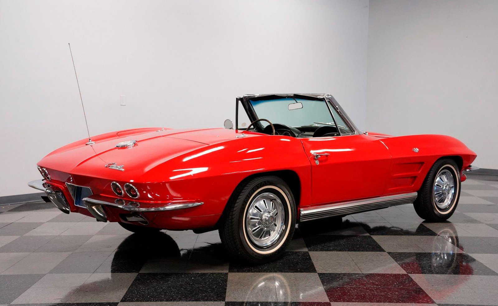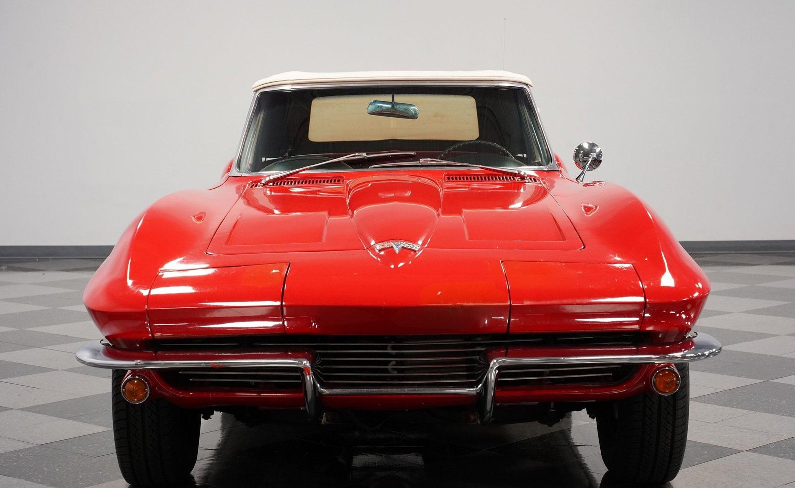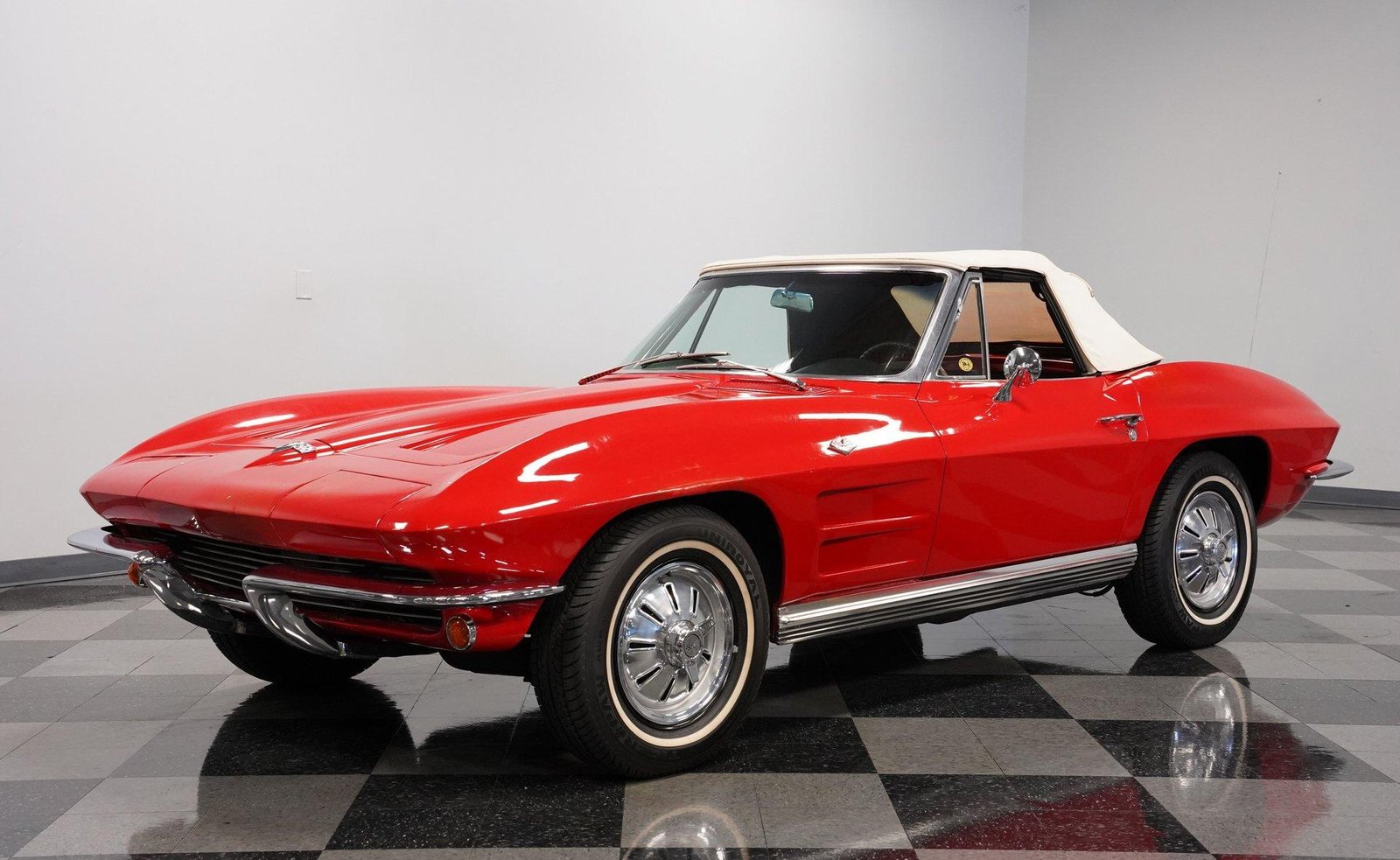 Exterior: Red exterior with chrome bumpers, 15″ wheels with 205/75R15 tires, convertible soft top plus removable hard top, and classic Stingray design lines defining this iconic C2.