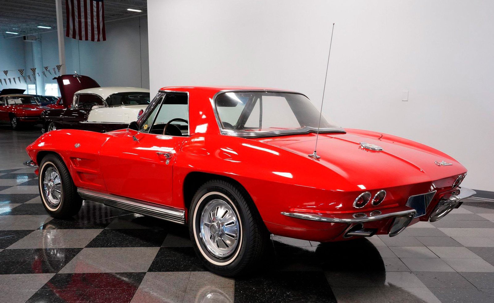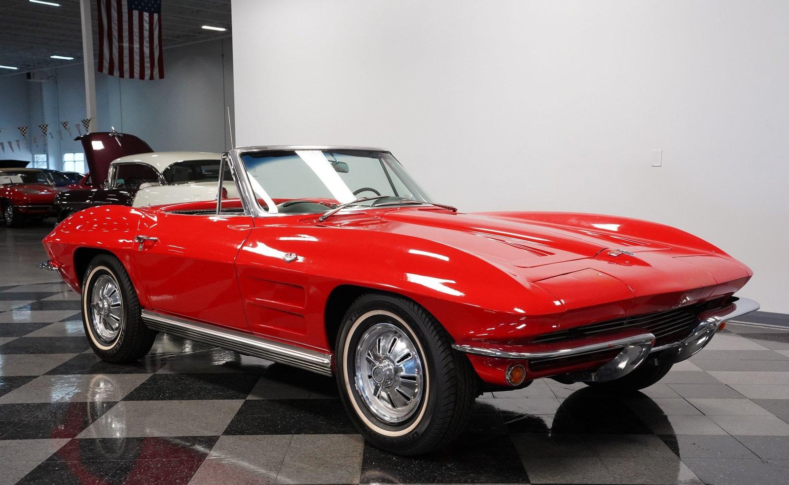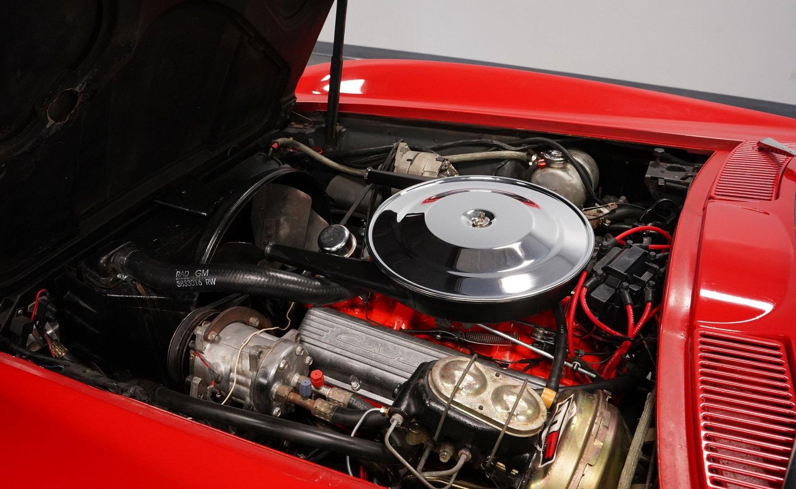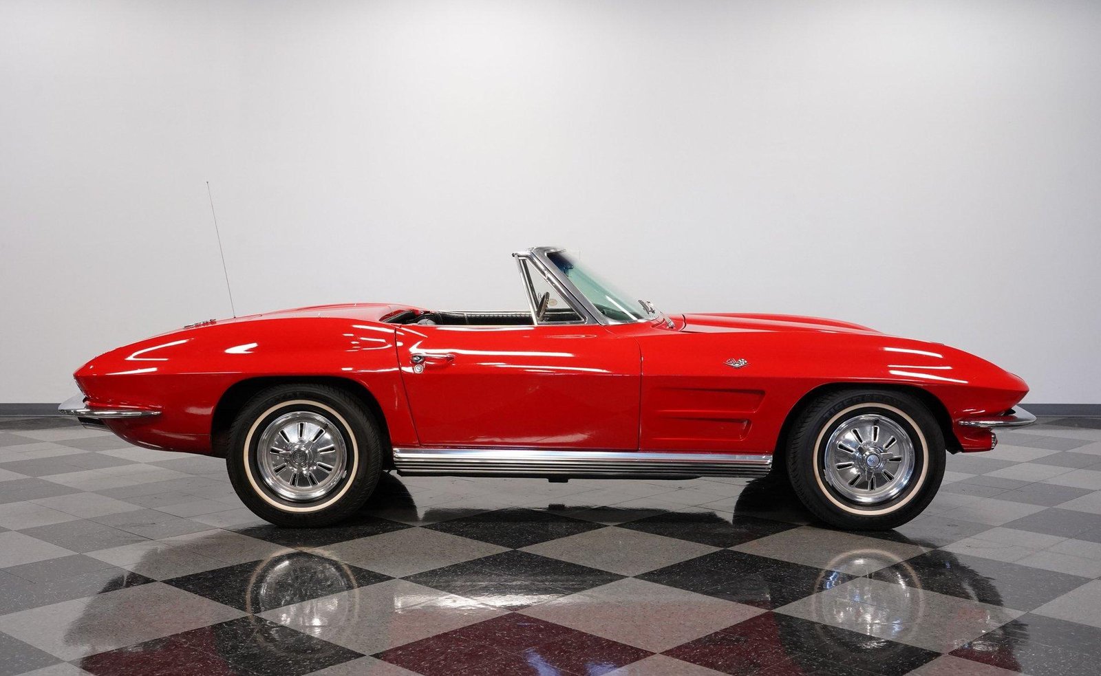 Exterior: Red exterior with chrome bumpers, 15″ wheels with 205/75R15 tires, convertible soft top plus removable hard top, and classic Stingray design lines defining this iconic C2.