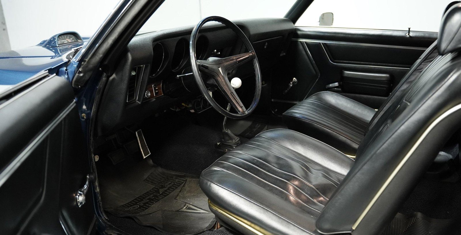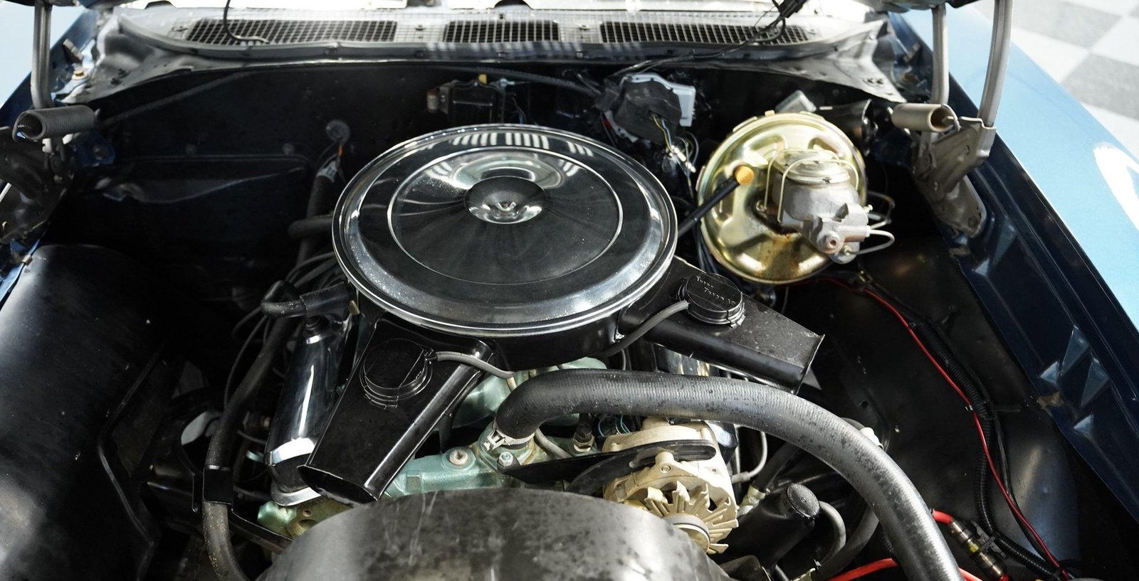 Exterior: Liberty Blue exterior, 15″ wheels wrapped in 245/60R15 tires, chrome bumpers and trim, clear hood tach, and well-detailed undercarriage reflecting careful restoration and maintenance.